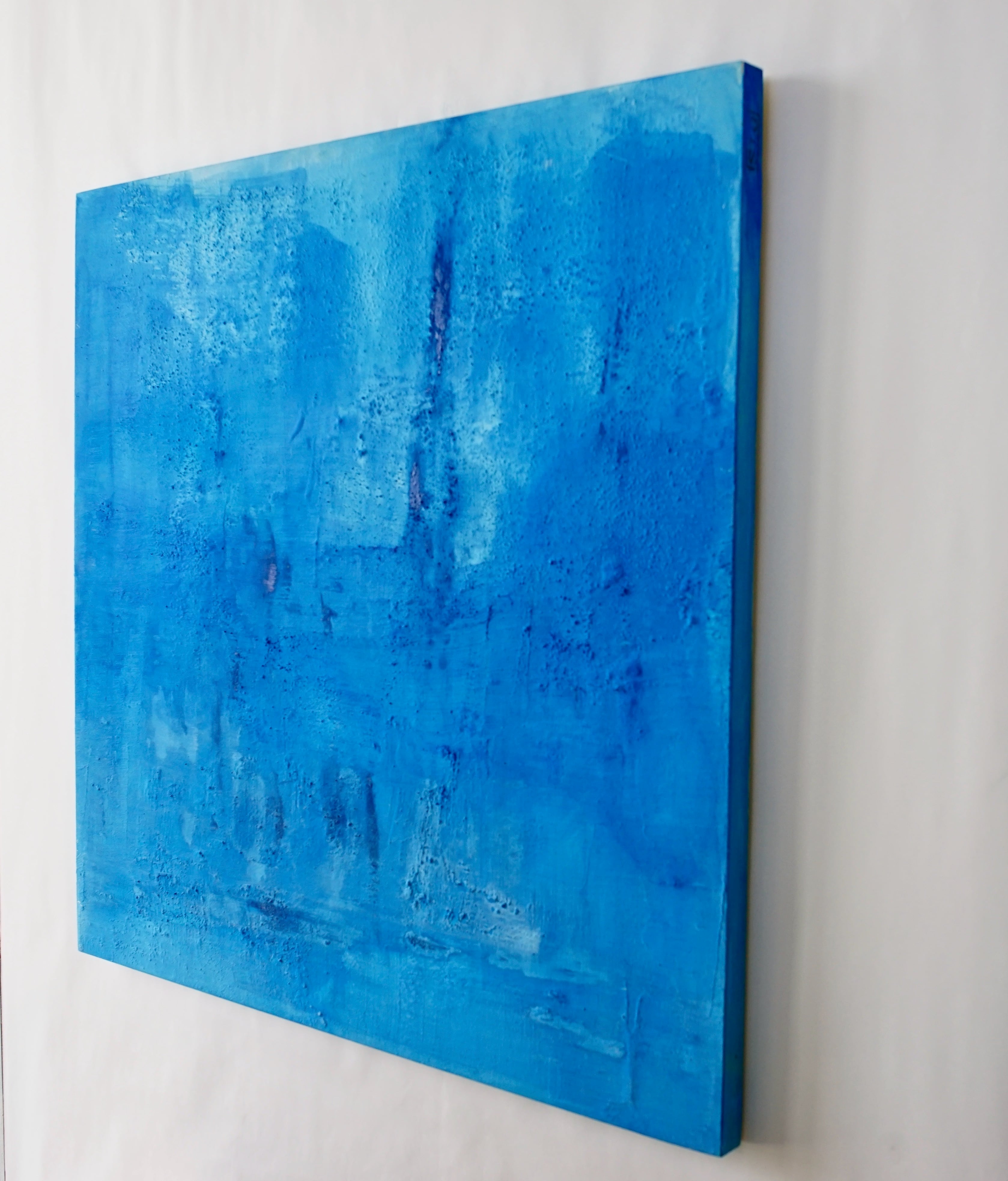 ざらついたテクスチュアと青を塗り重ねて、吸い込まれそうな深みのある青い世界を作りました。