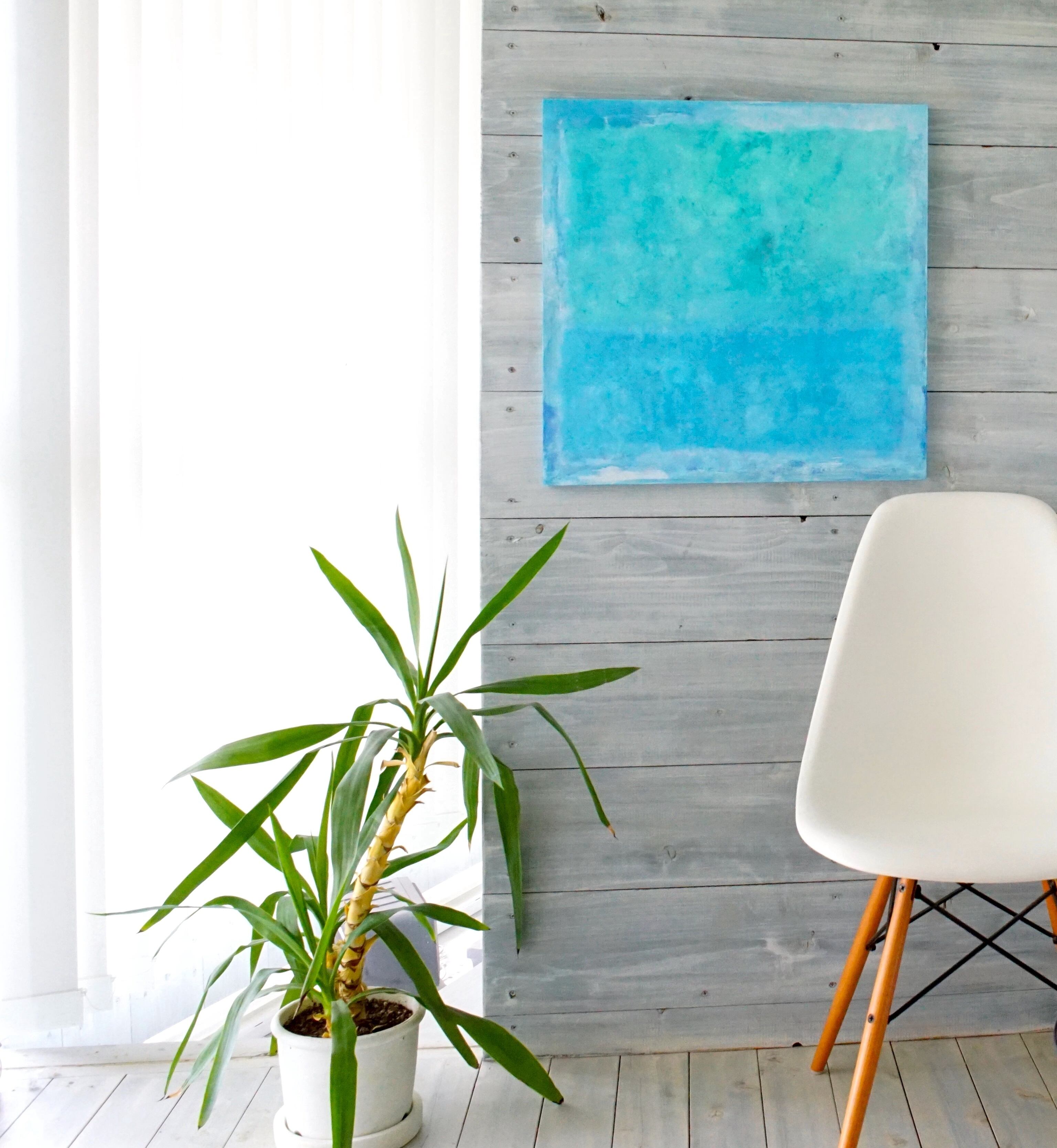 リビングや寝室などの広い空間に飾れば、青い絵は窓のように、抜けた印象をもたらします。トイレのような狭い空間では、より強く色を感じさせ、色の世界に引き込みます。