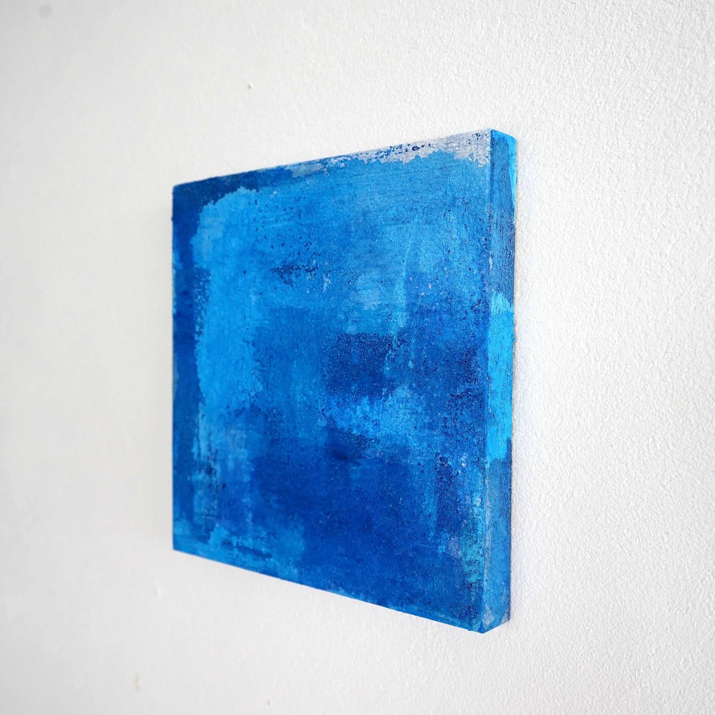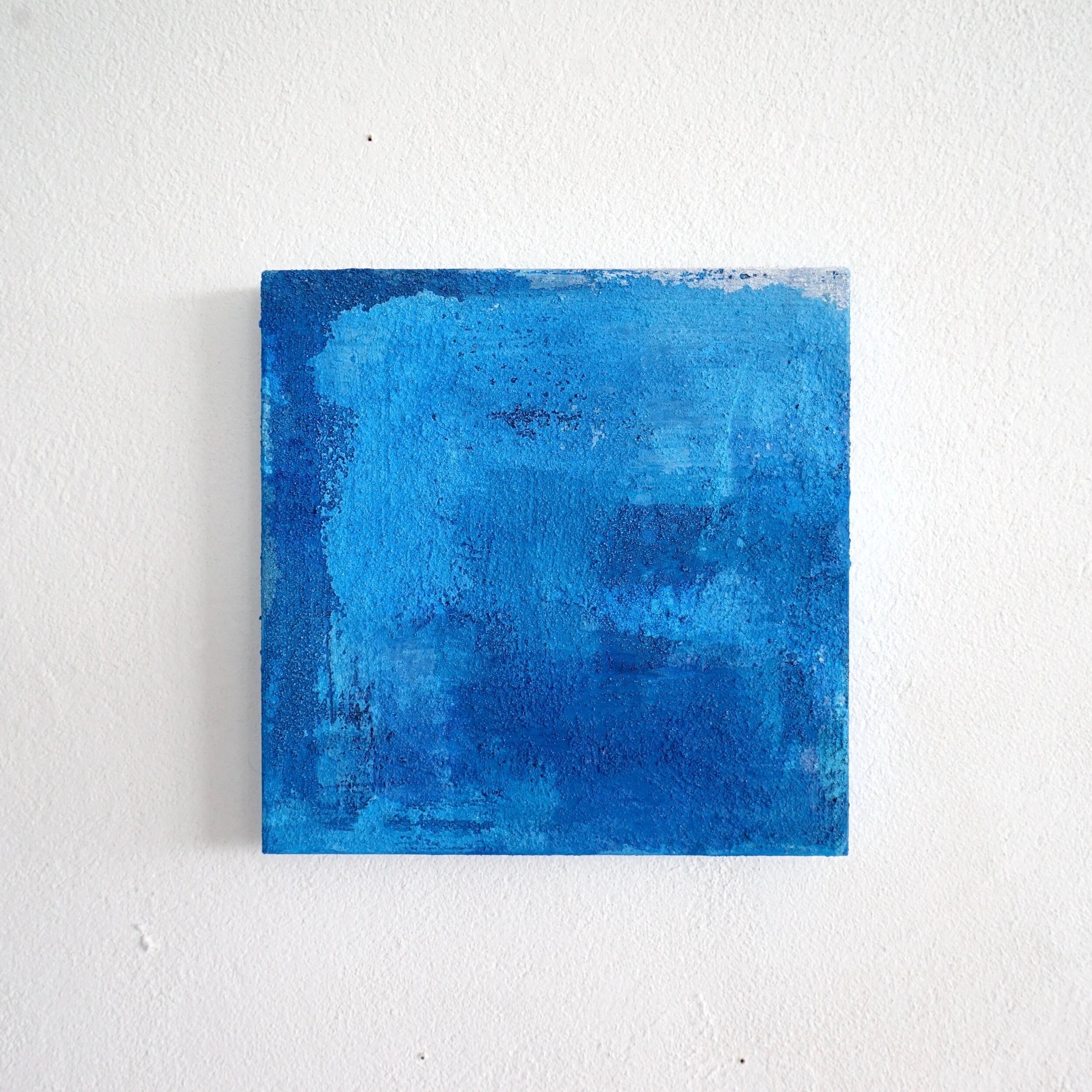 ざらついたテクスチュアと青を塗り重ねて、吸い込まれそうな深みのある青い世界を作りました。